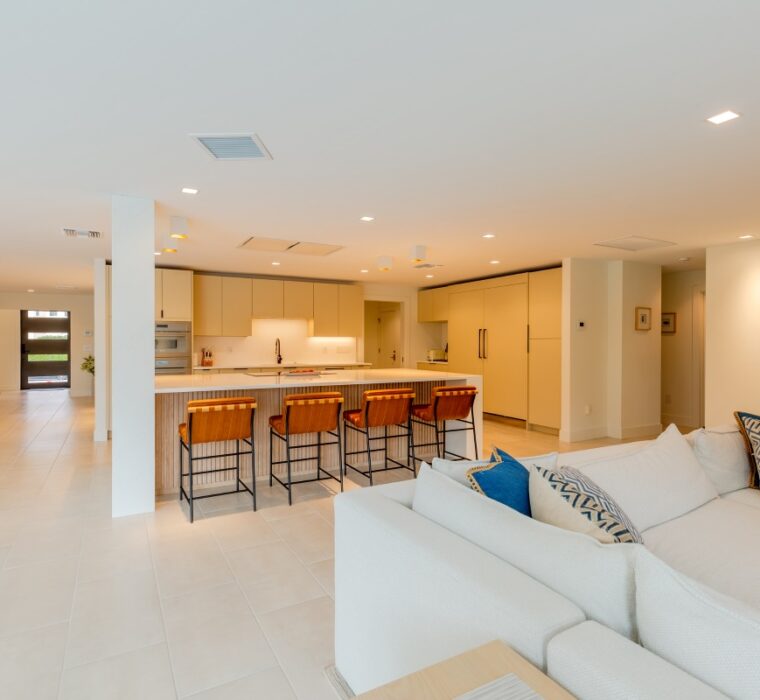 white marble kitchen overlooking living room