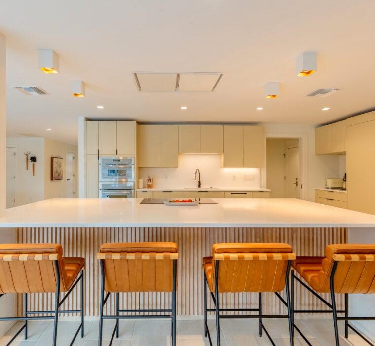 white kitchen with a bayside view